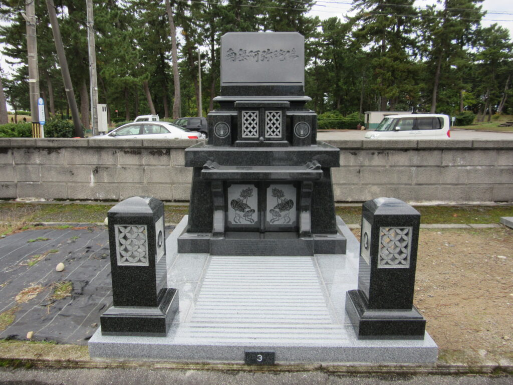御墓は横型で背丈ほどの高さ、灯篭は高さを抑えて安全な大きさのものを、ともに高級黒御影石をお選びいただきました。ありがとうございました。